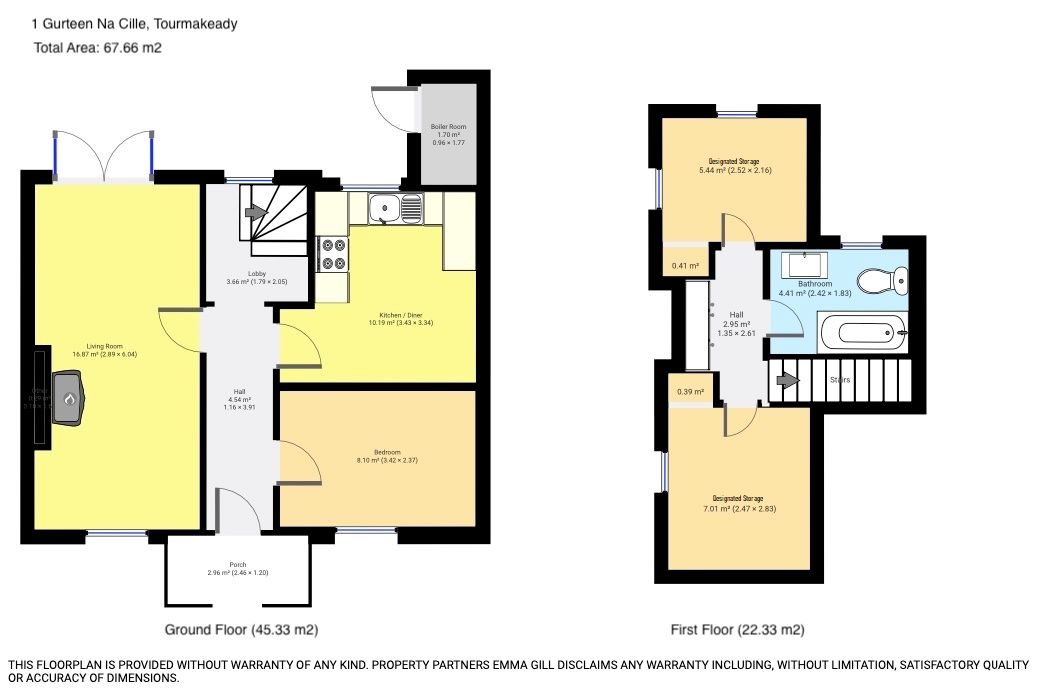 The property’s staircase is discreetly positioned to the rear of the ground floor at the end of the hall and leads to the other two large storerooms (5.44 m² and 7.01 m²) and a generous bathroom.